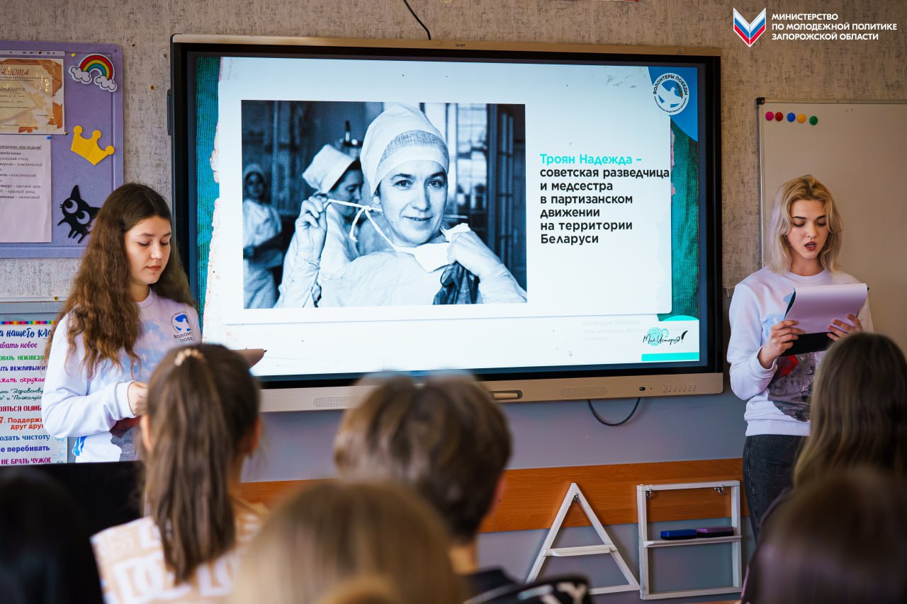 В преддверии Международного женского дня активисты молодёжного движения «Волонтеры Победы» провели урок памяти для учащихся 9-х классов Мелитопольской школы №20.